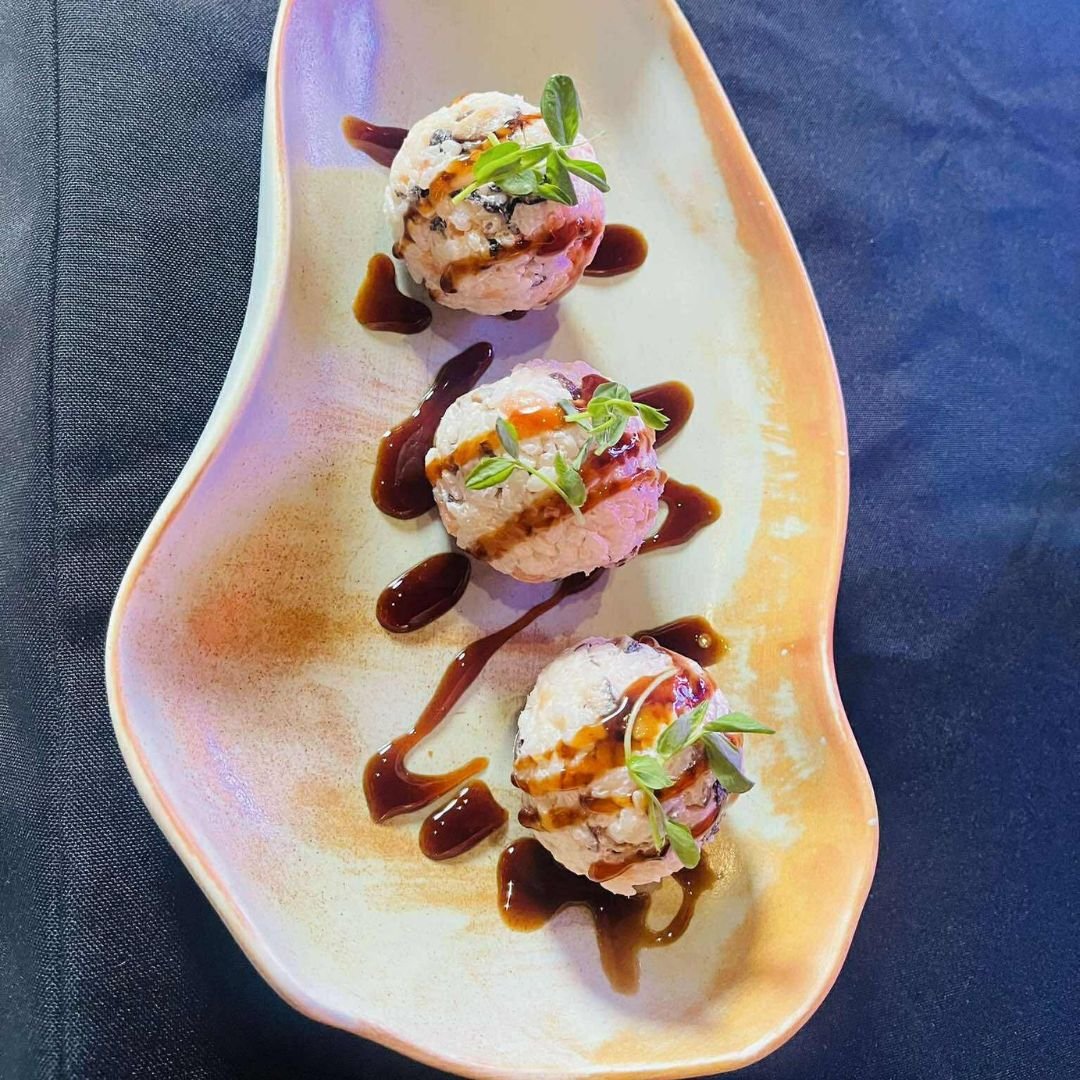 6. Бэлэн болсон бөмбөлөгөө тавганд тавьж, терияки соус, нарийн ногоогоор чимэглэнэ.
