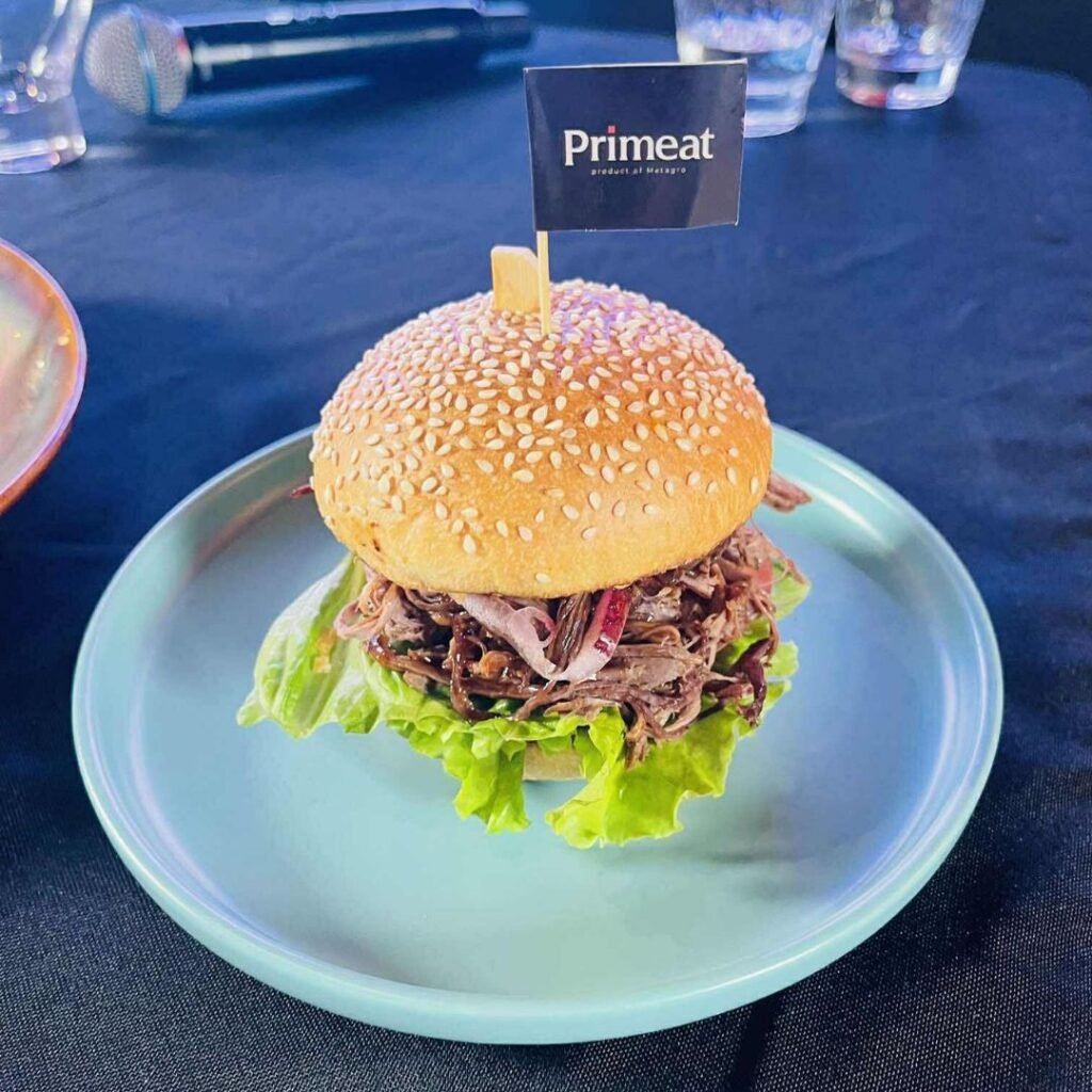 6. Бургер талхны дээд хэсэгт барбекью соус түрхээд махан дээрээ тавин хатгуураар хатгаж бэхлэн олгоно.